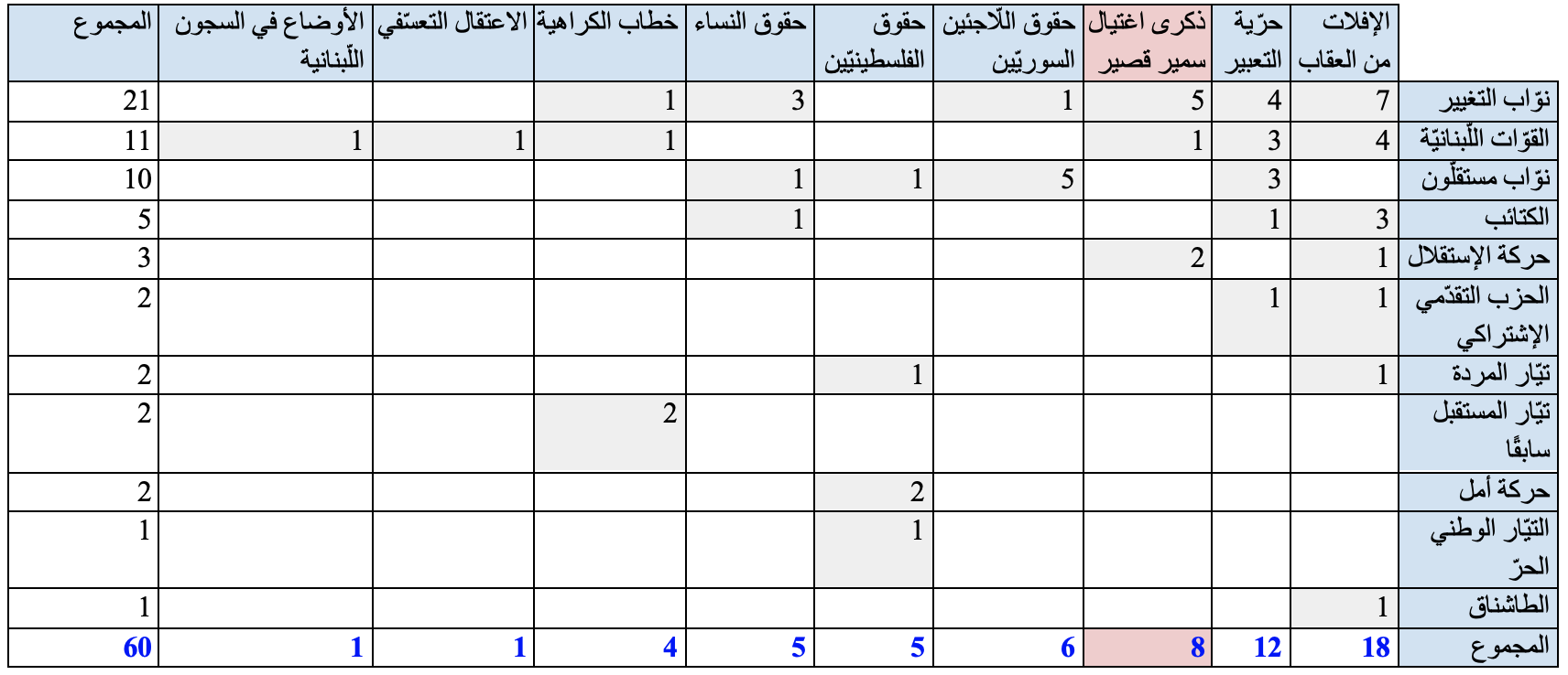خلال شهر حزيران 2023، سُجّلت زيادة طفيفة في عدد تصريحات النوّاب على مواقع التواصل الإجتماعي، حيث رُصد إجمالي 60 تصريحًا مقارنةً بـ44 تصريحًا في شهر أيار. ومن أصل هذه التصريحات الـ60، ركّزت 18 منها على الإفلات من العقاب في ما يتعلّق بقضية إنفجار مرفأ بيروت. بالإضافة إلى ذلك، تناولت 20 منها مسألة حرّية التعبير، وتمحورت 8 على وجه التحديد حول إحياء ذكرى اغتيال سمير قصير في 2 حزيران 2005، كما يظهر في الجدول 1.