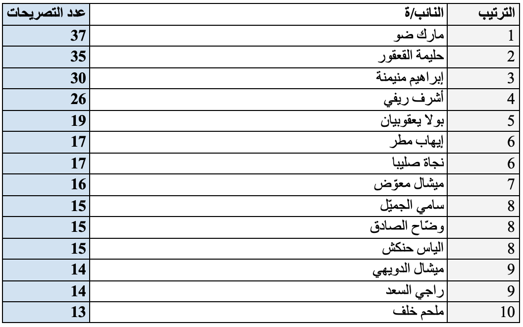 الجدول 4. ترتيب النوّاب من 1 إلى 10، حسب عدد التصريحات المنشورة في الفترة الممتدّة من حزيران/يونيو 2022 إلى نيسان/أبريل 2023