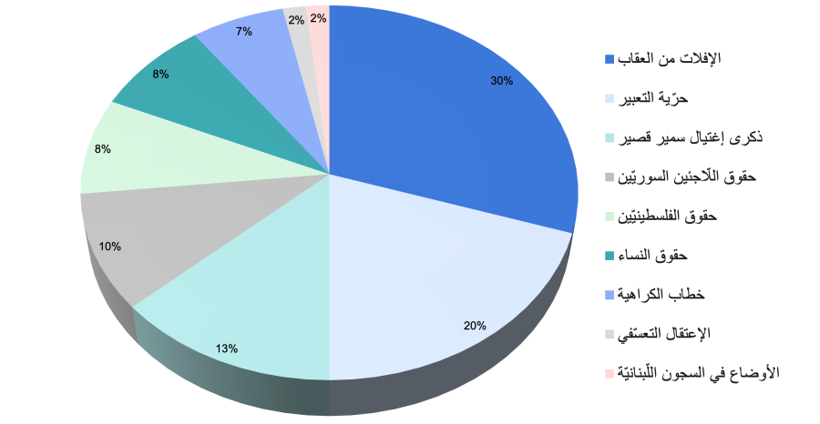 كما تجدر الإشارة إلى أنّ 4 من ضمن التصريحات الـ12 الأخرى حول حرية التعبير، تناولت القمع الذي مارسه وزير التربية ضدّ الناشطة نسرين شاهين، بينما سلّطت سبعة تصريحات أخرى الضوء على منع الإعلامية الكويتية فجر السعيد من دخول لبنان. وركّز تصريح واحد على حرية التعبير بشكل عام. بعبارات أخرى، علّقت الغالبية القصوى من التصريحات المرتبطة بحرّية التعبير على حالات القمع (92٪).