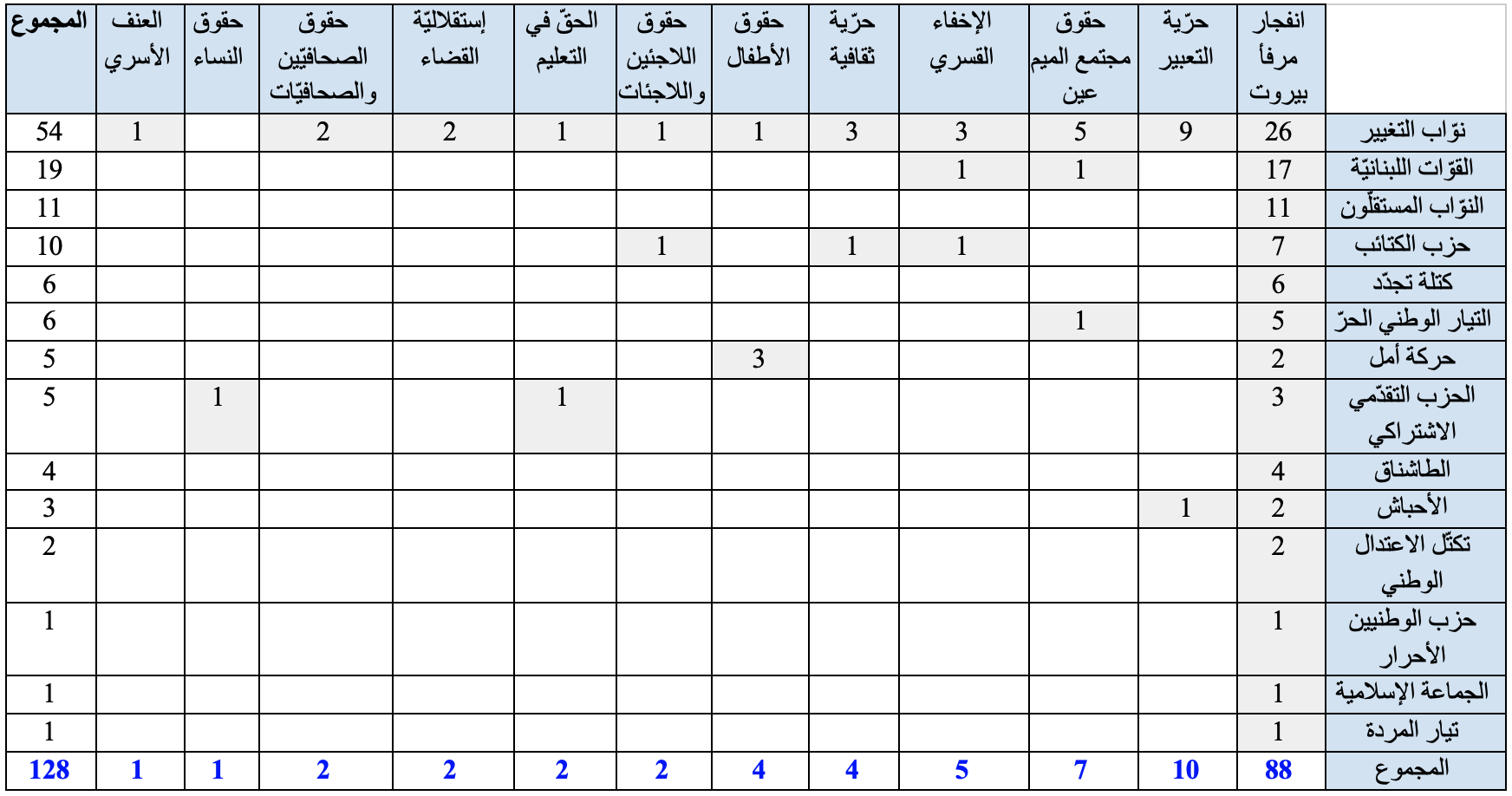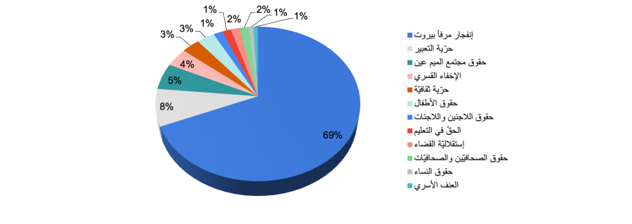 خلال شهر آب 2023، رُصد 88 تصريحًا لنواب لبنانيين تمحورت بشكل خاص حول ذكرى انفجار مرفأ بيروت في 4 آب 2020. وتجدر الإشارة إلى أن عشرة من هذه التصريحات خُصّصت للدفاع عن حرّية التعبير، بينما تناولت خمسة منها قضية الاعتقال غير القانوني للممثّا الكوميدي نور حجّار. بالإضافة إلى ذلك، برز تركيز في إجمالي سبعة تصريحات، على حقوق الأفراد من مجتمع الميم عين (LGBTQIA+).
