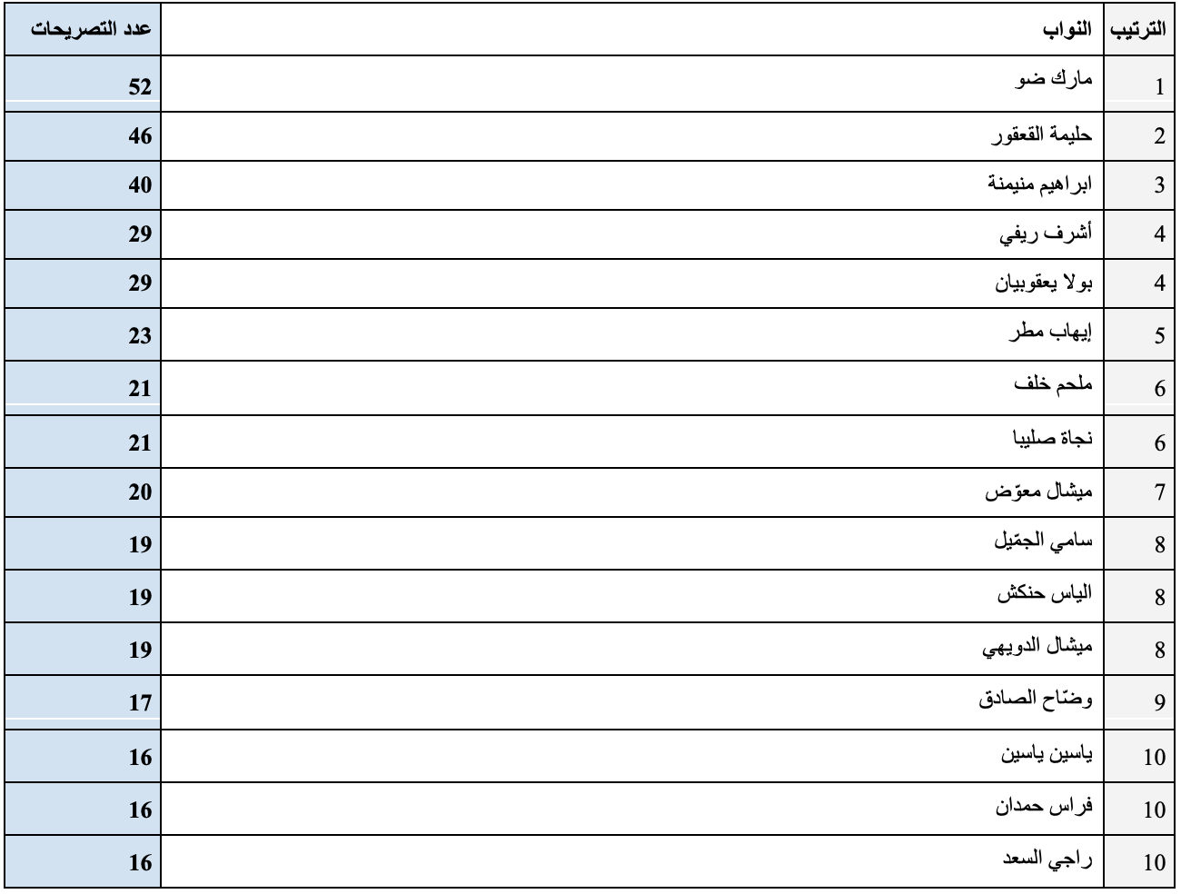 الجدول 4. ترتيب النواب من 1 إلى 10، حسب عدد التصريحات المنشورة في الفترة الممتدة من حزيران 2022 إلى آب 2023