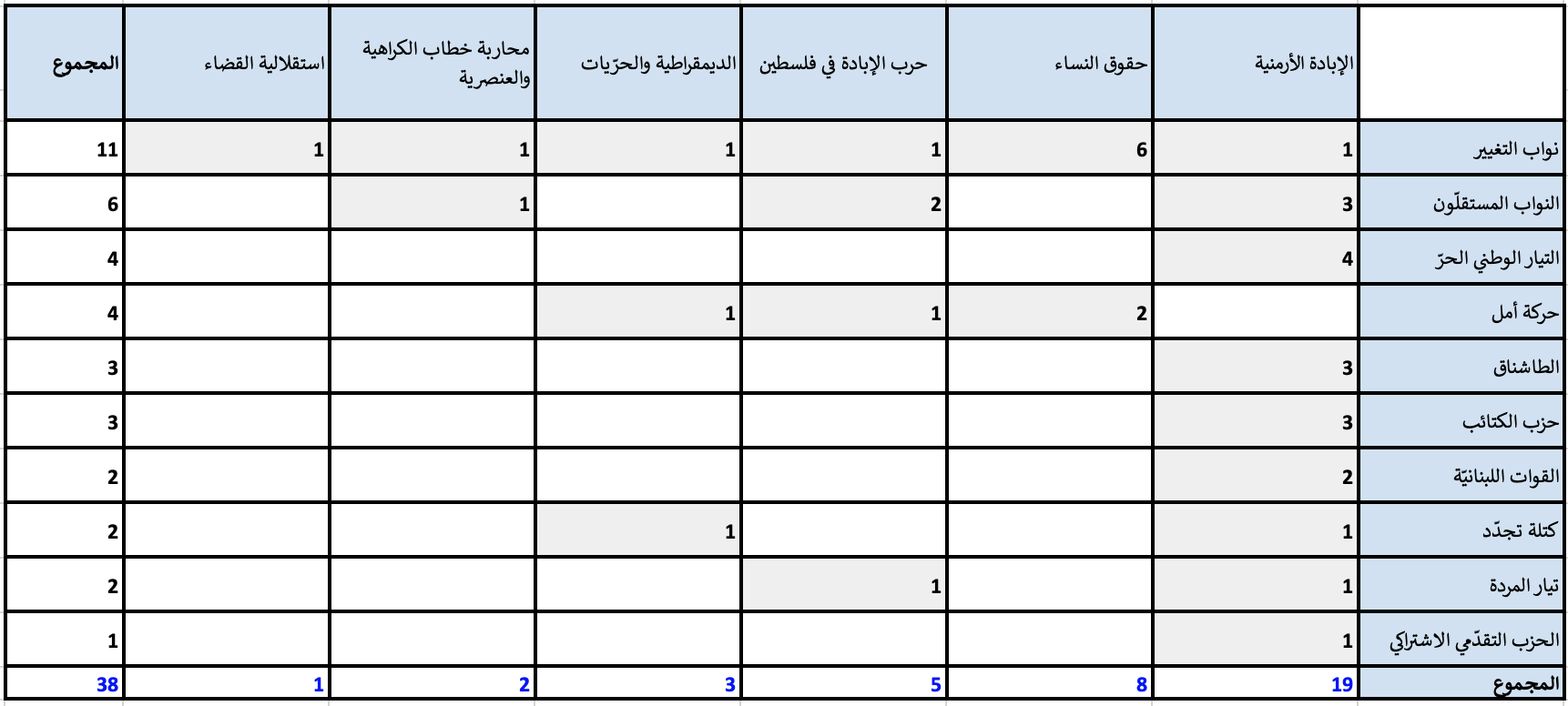 بالإضافة إلى ذلك، ركّزت ثمانيةٌ من التصريحات (للنواب حليمة القعقور وعناية عز الدين ومارك ضو وبولا يعقوبيان) على حقوق النساء، وخمسةٌ منها (للنواب حليمة القعقور وإيهاب مطر وعناية عز الدين وأسامة سعد وطوني فرنجية) على حرب الإبادة في فلسطين. وسلّطت ثلاثة تصريحات الضوء على الديمقراطية والحرّيات (للنواب مارك ضو وميشال معوّض وميشال موسى)، وندّد تصريحان (للنائبين جميل السيّد ومارك ضو تعليقاً على العنف الذي استهدف اللاجئين عقب مقتل منسّق حزب القوات اللبنانية في منطقة جبيل، باسكال سليمان)، بخطاب الكراهية والعنصرية تجاه اللاجئين السوريين. وركّز تصريحٌ واحد (للنائبة حليمة القعقور) على استقلالية القضاء.