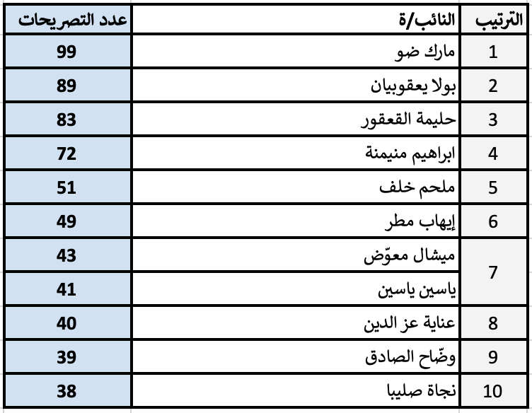 الجدول 4. ترتيب النواب من 1 إلى 10، حسب عدد التصريحات المنشورة في الفترة الممتدّة من حزيران 2022 إلى نيسان 2024
