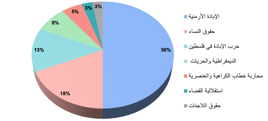 وتوزّعت مواضيع التصريحات بين إحياء ذكرى الإبادة الأرمنية وتجديد الدعوة لإحقاق العدالة للضحايا (بنسبة 50%) وحقوق النساء (21%) وحرب الإبادة المستمرة في فلسطين (13%).