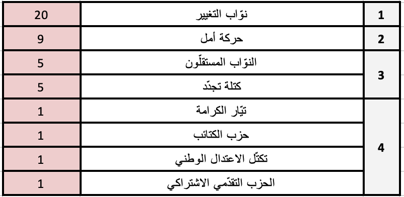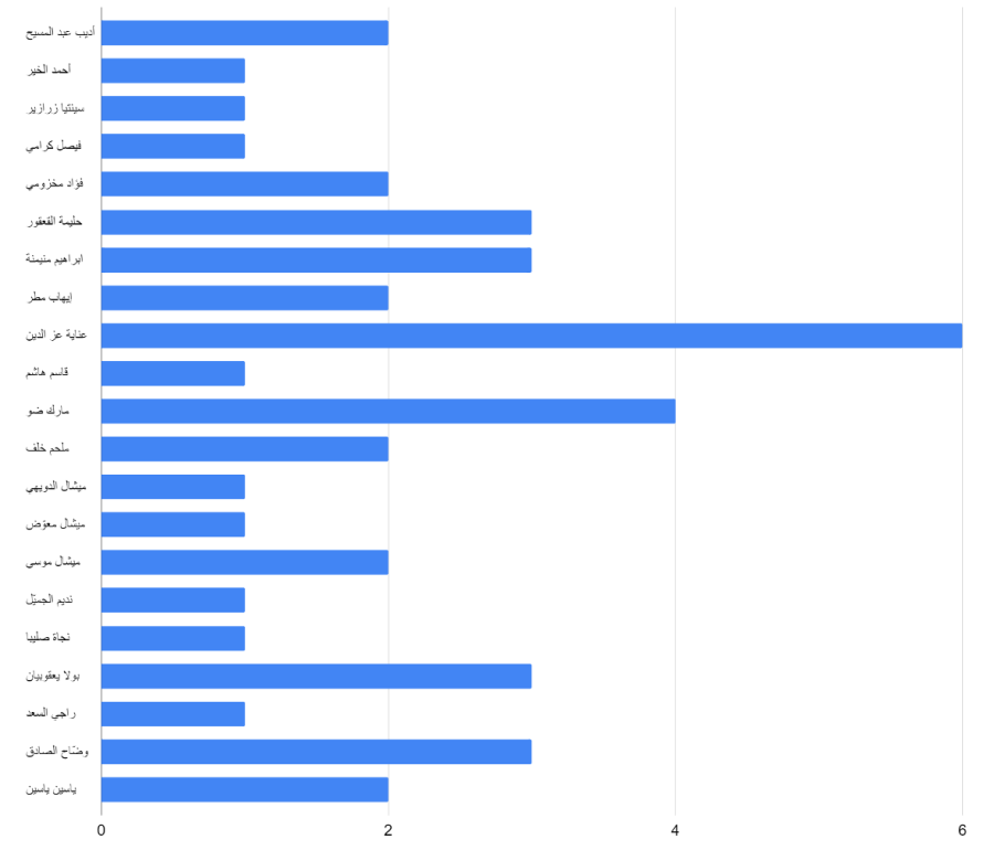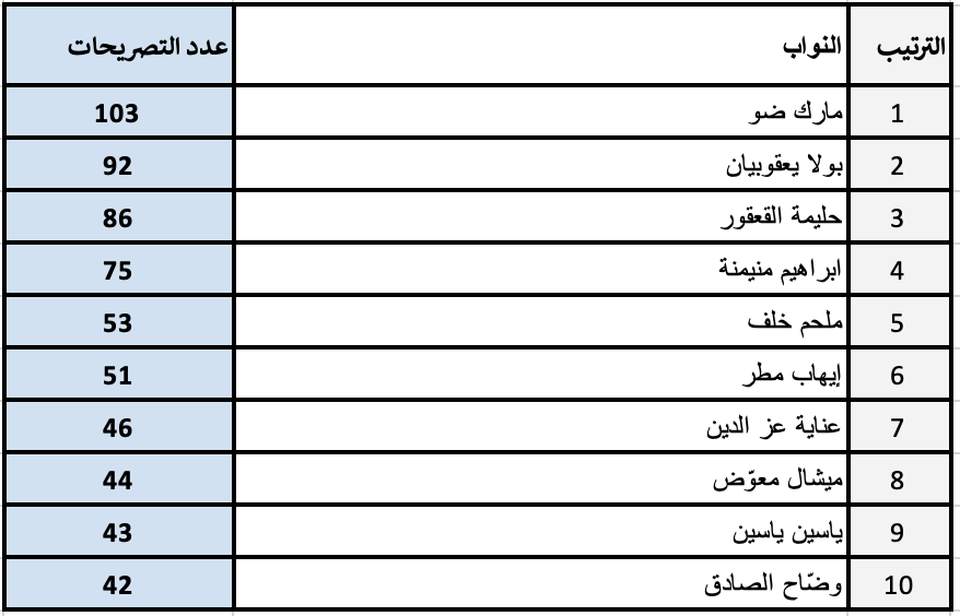الجدول 4. ترتيب النوّاب من 1 إلى 10، حسب عدد التصريحات المنشورة في الفترة الممتدّة من حزيران 2022 إلى أيار 2024