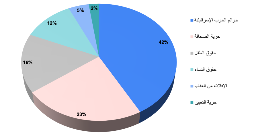 كما تمحورت نسبة 42٪ من التصريحات المرصودة في شهر أيار حول جرائم الحرب الإسرائيلية، بينما ألقت نسبة 23٪ منها الضوء على حرّية الصحافة، بمناسبة اليوم العالمي لحرّية الصحافة (3 أيار). وركّزت نسبة 16٪ منها على حقوق الطفل، في ضوء قضية عصابة "التيك التوك" المتّهمة باغتصاب الأطفال، وخصّصت نسبة 12٪ لحقوق المرأة. أما التصريحات المتبقّية فتناولت موضوعَيْ الإفلات من العقاب وحرّية التعبير.