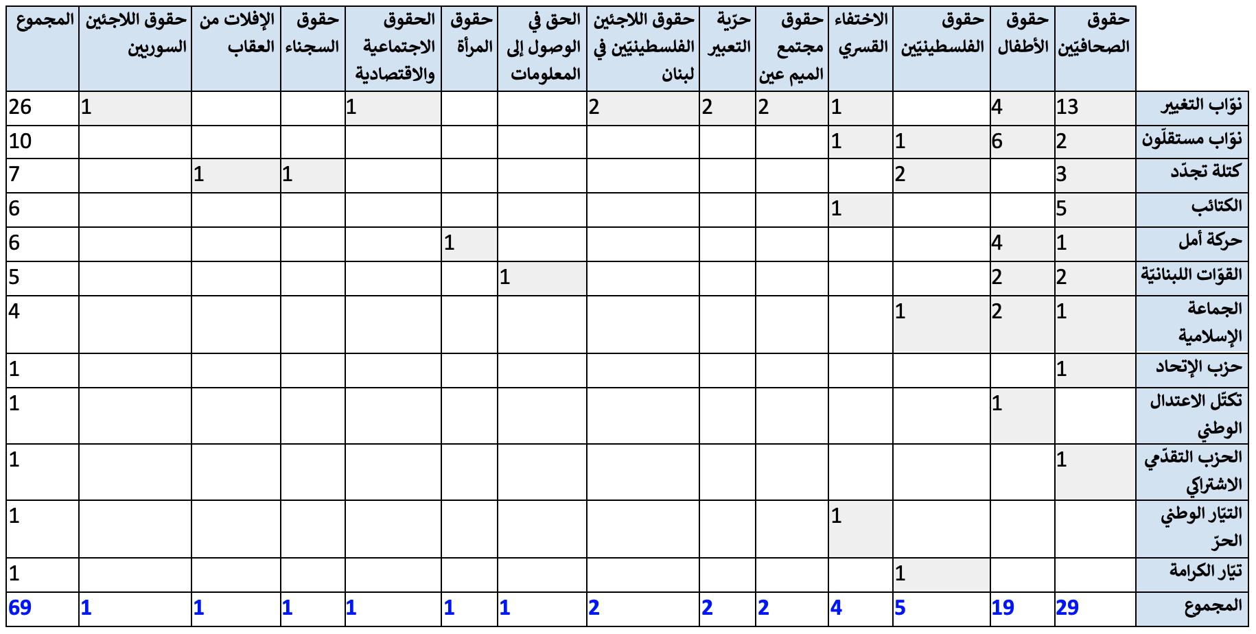 خلال شهر تموز/يوليو 2023، نشر 37 نائبًا لبنانيًا ما مجموعه 69 تصريحًا تندرج في سياق حقوق الإنسان، عبر حساباتهم الخاصة على مواقع التواصل الاجتماعي. وحيث أن هذا التقرير يتوخّى التركيز على التصريحات المرتبطة مباشرةً بحقوق الإنسان، استُبعِدَت منه تلك التي خرجت عن هذا النطاق. وتمحورت التصريحات المستبعَدة حول مواضيع مثل مقتل شابين بشكل مأسوي في جرود بشرّي وردود الفعل على قرار البرلمان الأوروبي بشأن لبنان. وكان هذا القرار قد عبّر، من جملة مواضيع أخرى، عن القلق من تصاعد الخطاب المناهض للّاجئين من قِبل الأحزاب السياسية اللبنانية. الأمر الذي شجبه النواب بشكل واضح.