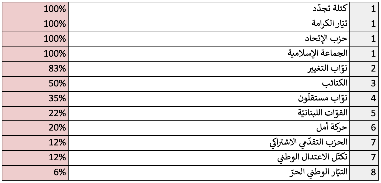 الجدول 3. الترتيب على أساس الأرقام النسبية – من المجموعة السياسية ذات النسبة المئوية الأعلى للأعضاء الذين أدلوا بتصريحات إلى المجموعة ذات النسبة الأقلّ