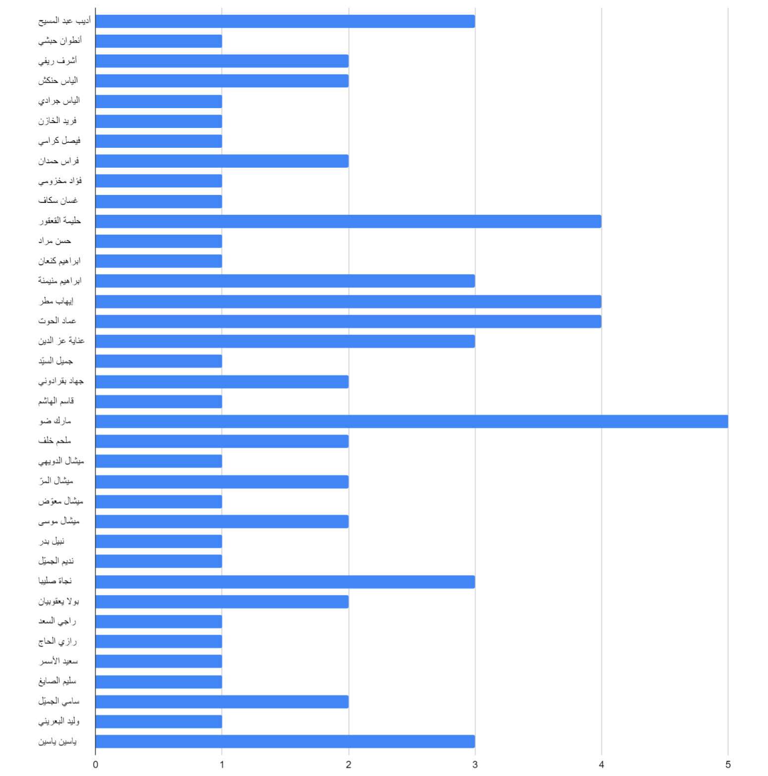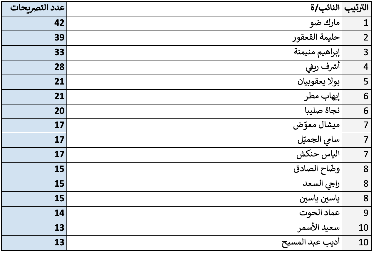 إذا نظرنا إلى العدد التراكمي للتصريحات المنشورة اعتبارًا من 1 حزيران/يونيو 2022، نلاحظ نمطًا ثابتًا، حيث يحافظ النواب مارك ضو وحليمة القعقور وإبراهيم منيمنة على ترتيبهم في المقدّمة. وذلك منذ شهر كانون الثاني/يناير 2023.