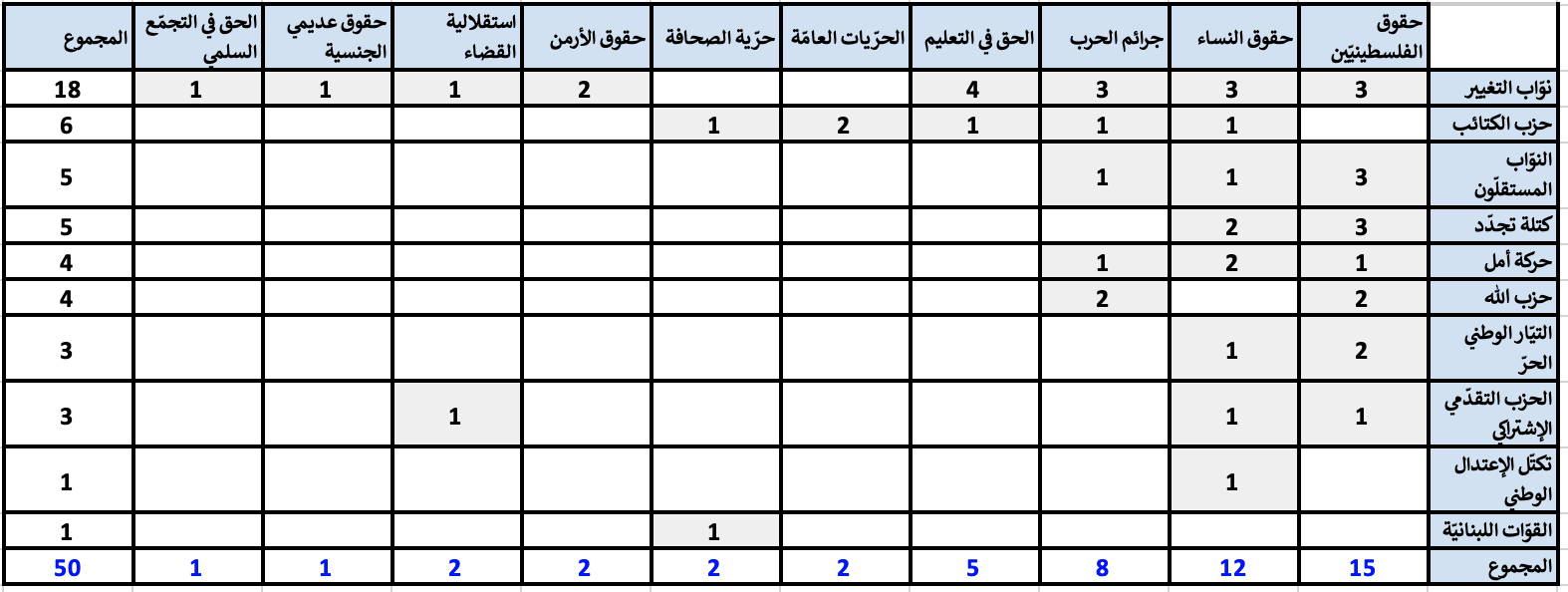 وخلال شهر كانون الأول، تناول النوّاب بغالبيتهم مواضيع التمديد لقائد الجيش العماد جوزاف عون وإحياء ذكرى اغتيال النائب السابق جبران تويني والتهاني بعيدَي الميلاد ورأس السنة. ولكنّ مثل هذه التصريحات استُثني من هذا التقرير، نظرًا إلى أنه يتوخّى التركيز بشكل حصري على حقوق الإنسان.