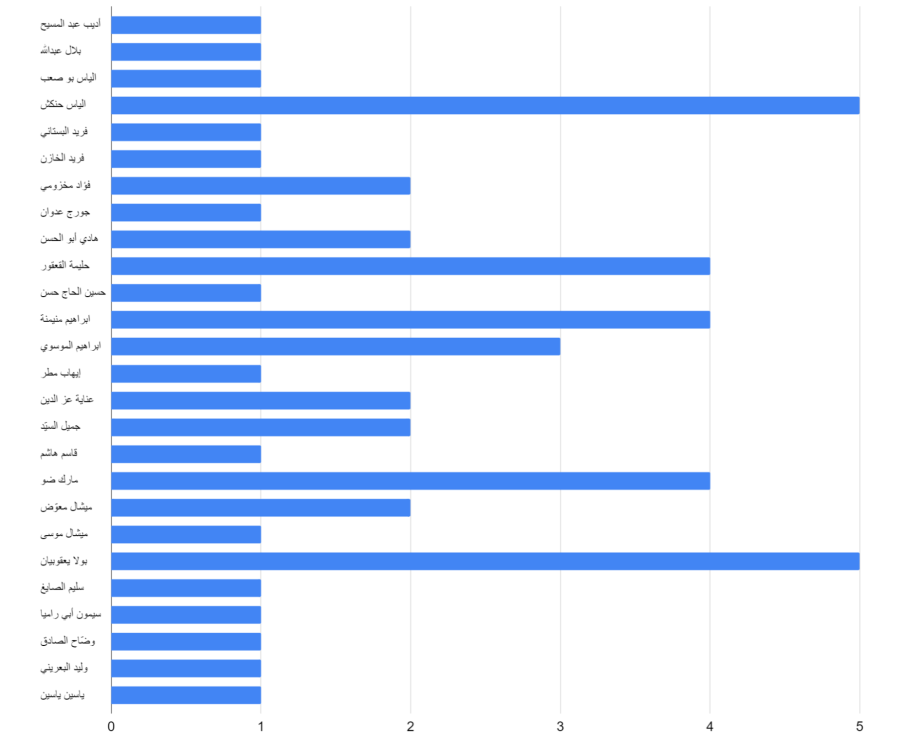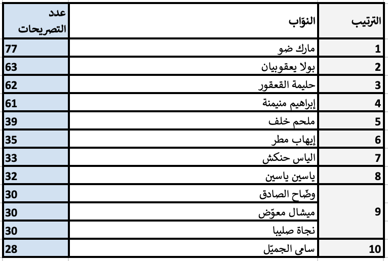 الجدول 4. ترتيب النواب من 1 إلى 10، حسب عدد التصريحات المنشورة في الفترة الممتدّة من حزيران 2022 إلى كانون الأول 2023