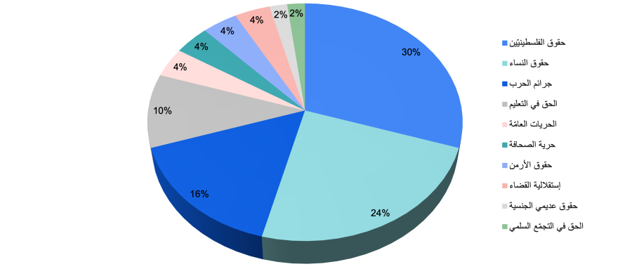 من أصل التصريحات الخمسين المرصودة، ركّز 15 تصريحًا على حقوق الفلسطينيّين، و12 منها على حقوق النساء، بينما سلّطت 8 منها الضوء على جرائم الحرب الإسرائيلية. وتنوّعت المواضيع الأخرى بين الحق في التعليم وحرّية الصحافة وحقوق الأرمن.