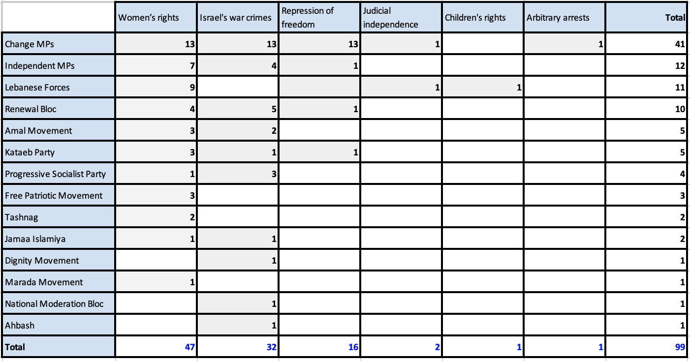 In March 2024, Lebanese Members of Parliament (MPs) issued a total of 99 statements concerning human rights.