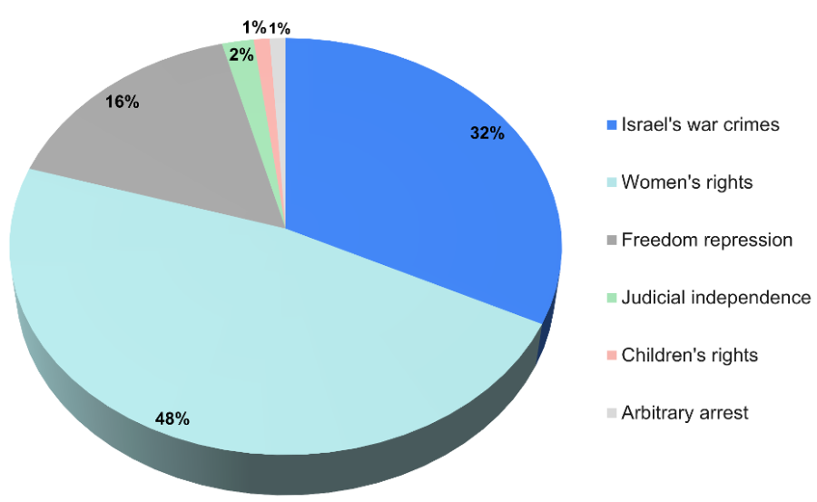 Of these statements, 48% were dedicated to topics related to women, either commemorating International Women’s Day on March 8 or addressing women’s rights issues. Additionally, 32% of the statements focused on Israel’s war crimes, while 16% highlighted instances of repression of freedom.