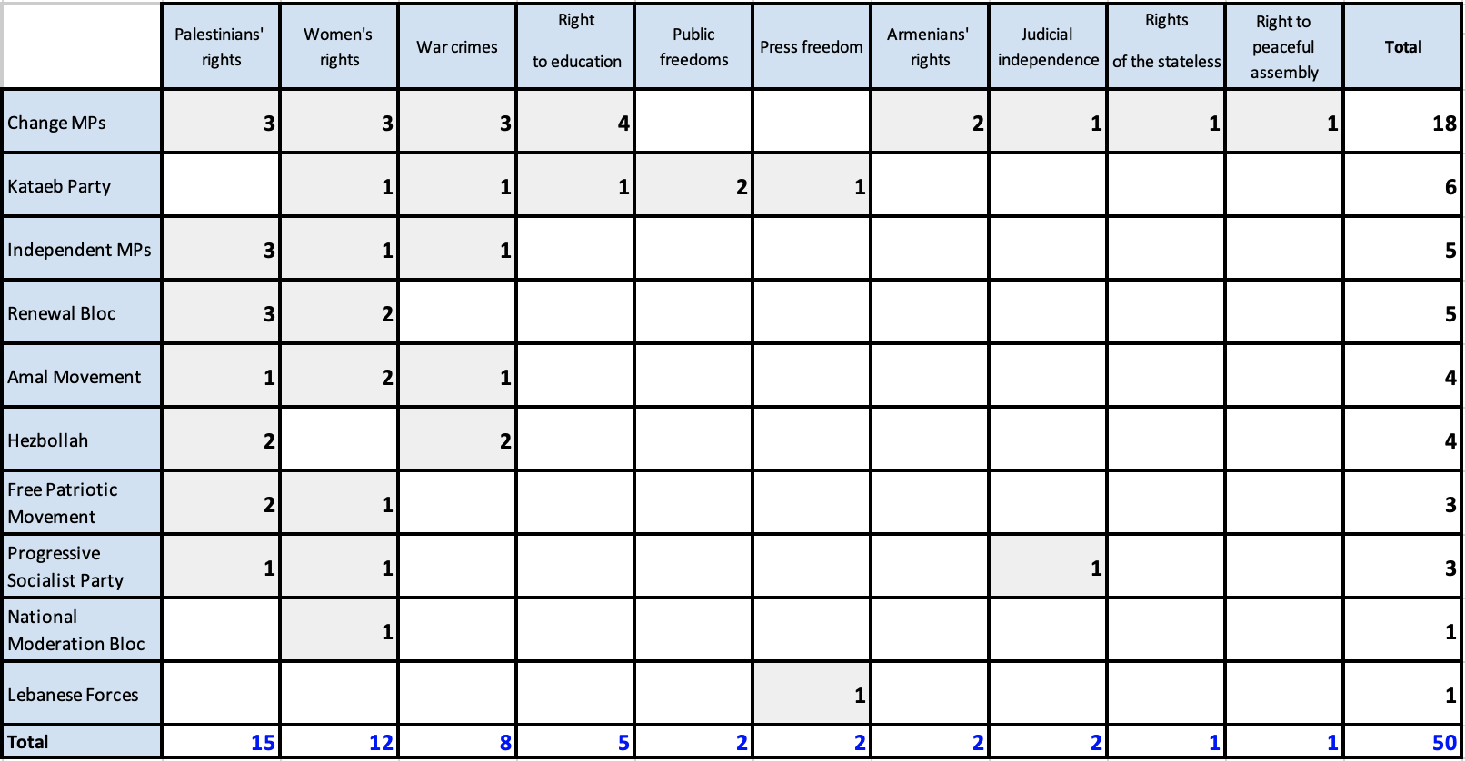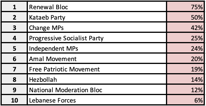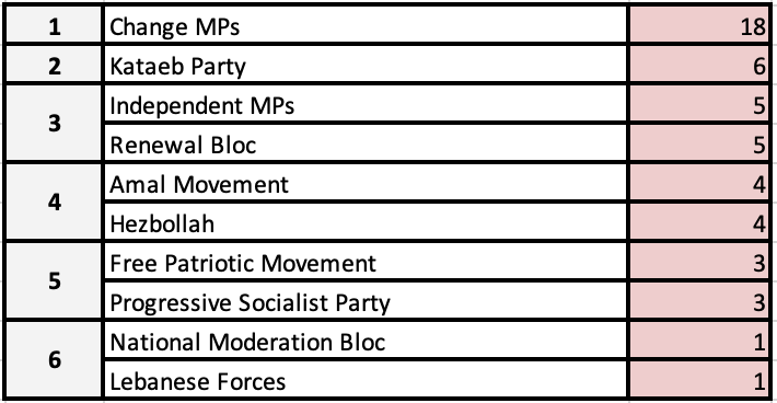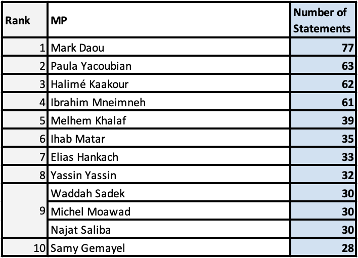 A notable decline in the Lebanese Forces’ ranking is observed, as only one LF MP issued a statement on human rights — an unprecedented occurrence since the commencement of this monitoring in June 2022.
