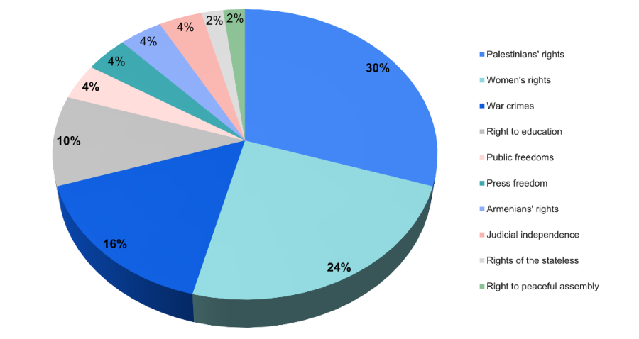 Among the 50 statements, a noteworthy emphasis was placed on the rights of Palestinians, comprising a total of 15 statements. Additionally, 12 statements were dedicated to women’s rights, while eight addressed Israel’s war crimes. The remaining statements delved into various other topics including the right to education, press freedom and Armenians’ rights.