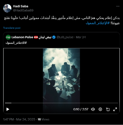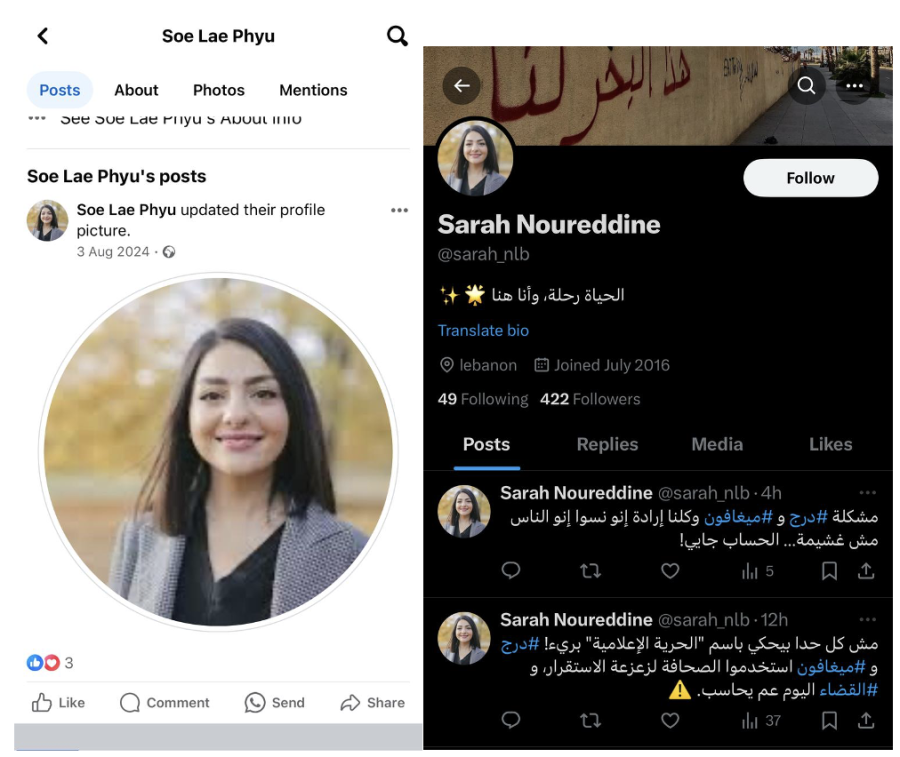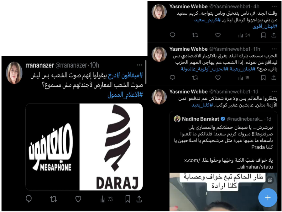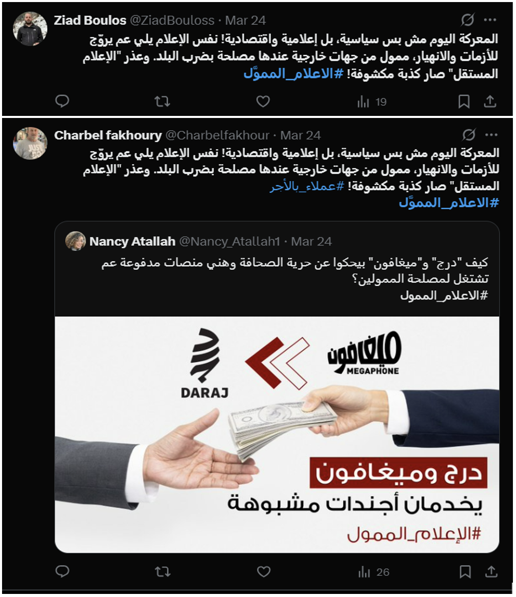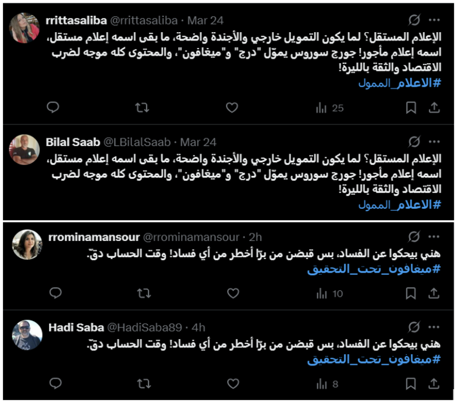 The evidence collected strongly indicates that the digital campaign targeting Megaphone and Daraj Media was carefully coordinated, employing deceptive practices designed to artificially amplify specific political narratives. The accounts involved exhibited clear patterns: synchronized posting timelines, strikingly similar content and language, and the suspicious reuse of profile images, some likely AI-generated or appropriated from unrelated online profiles. Moreover, this orchestrated effort aligns closely with messaging recently disseminated by certain Lebanese media outlets, notably MTV and others funded by influential banking interests.