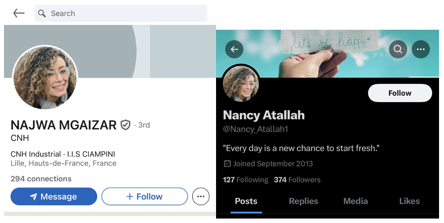 Lastly, the account operating under the name "Nancy Atallah," whose participation in the coordinated dissemination of content against Megaphone, Daraj, and Kulluna Irada we have previously confirmed, uses a profile picture identical to one associated with a LinkedIn account based in France (see evidence below).